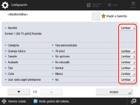 Puede pulsar [Cambiar] para cada elemento para cambiar la información del tipo de papel.