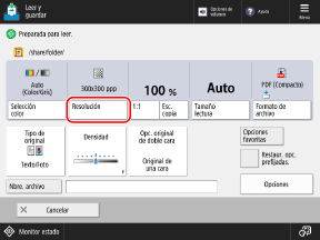 En la pantalla de escaneado, pulse el botón de configuración de la resolución. Pantalla de lectura