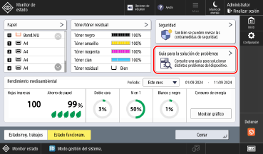 La información de soporte para solucionar problemas al imprimir, enviar faxes y enviar datos escaneados se puede consultar en [Guía para la solución de problemas] en el estado operativo del equipo. Comprobación del estado operativo del equipo