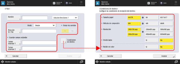 Establezca las condiciones de destino según las especificaciones del equipo de destino. Si establece condiciones que no admite el equipo de destino, se puede producir un error.