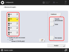 De forma predeterminada, el tipo de papel está ajustado a Normal 1 o Normal 2. Cuando se carga papel de un tamaño distinto o el tamaño indicado en el panel de control es diferente del del papel cargado, cambie la configuración del papel.
