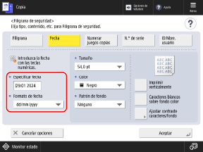 Las opciones configuradas en la pantalla [Filigrana de seguridad] se aplican al formato de caracteres de la impresión de muestra.