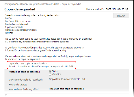Si la cantidad de [Espacio disponible en ubicación de copia de seguridad] no es suficiente para los requisitos de [Capacidad para copia de seguridad], vuelva a configurar la ubicación de almacenamiento de los datos de la copia de seguridad.