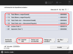 Puede visualizar los contadores y comprobar el número de páginas impresas y copiadas y el número de páginas escaneadas y enviadas, y de páginas enviadas por fax hasta la fecha mediante impresión en blanco y negro e impresión a color.
