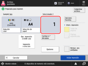 Puede imprimir directamente archivos PDF, XPS, JPEG y TIFF en un dispositivo de memoria USB insertado en el equipo desde el panel de control.