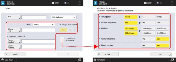 Sélectionnez les conditions de destinataire conformément aux spécifications de la machine destinataire. Si vous sélectionnez des conditions non prises en charge par la machine destinataire, une erreur peut se produire.