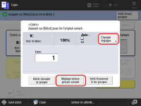 Appuyez sur [Réglage lecture groupe suivant], puis configurez les réglages de copie pour le deuxième original.