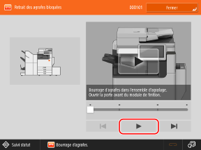* L’écran s’affiche à plusieurs reprises jusqu’à ce que le bourrage papier ou d’agrafes soit éliminé. Si vous appuyez sur [Fermer], il se peut que l’écran se ferme temporairement et que vous puissiez effectuer une autre opération ou un autre réglage.