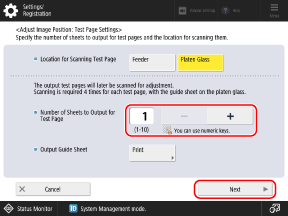 Selecione [Feeder] para [Location for Scanning Test Page], defina o número de folhas a serem impressas e pressione [Next].