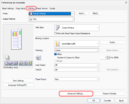 Na guia [Acabamento], clique em [Configurações avançadas].
