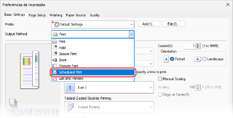 Você pode definir a impressão agendada nas configurações de impressão do driver e enviar os dados de impressão para a máquina.