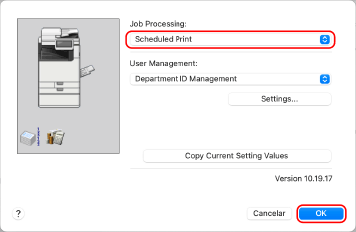 Em [Job Processing], selecione [Scheduled Print] e clique em [OK].