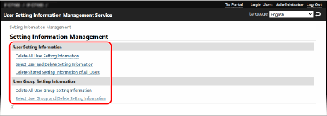 Na página do Portal da UI Remota clique em [User Setting Information Management]. Página do portal da UI Remota