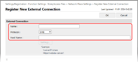 Insira [Host Name] e clique em [Settings]. Na tela [Folder Path Settings], digite [Folder Path] e clique em [OK].