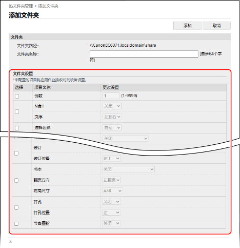 可以添加“热文件夹”,从而只需将文件复制到高级存储箱的共享文件夹即可进行打印。