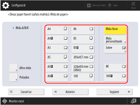 A més, també podeu configurar la pantalla que es mostra quan es carrega paper a la safata multiús a la pantalla per seleccionar el "Paper favorit" perquè pugueu definir ràpidament la mida i el tipus de paper.