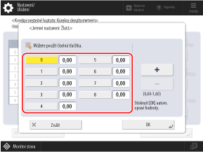 Změřte barevné vzorky 0 až 8 na testovacím výtisku pomocí denzitometru a pro každé číslo zadejte naměřenou hodnotu sytosti.