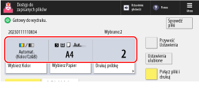 Aktualnie ustawiony kolor wydruku, używany papier i liczba wydruków są wyświetlane na środku ekranu. Sprawdź te ustawienia, aby zapewnić prawidłowe drukowanie.