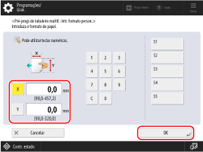Dependendo da orientação e do formato dos envelopes, [Seguinte] pode aparecer. Pressione [Seguinte], insira o comprimento da aba ou tamanho (comprimento do lado) dos envelopes e, em seguida, pressione [OK].