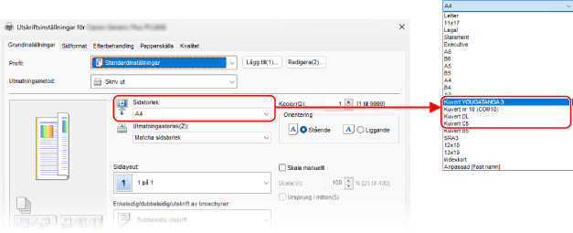 I [Sidstorlek] på fliken [Grundinställningar] väljer du formatet på kuvertet.