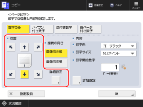 ※部数番号と併せて他の情報も付けるように設定されている場合は、[全面に印字]と[5箇所に印字]は選択できません。