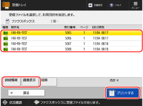 プリントするファクスを選択し、[プリントする][プリント開始]を押します。