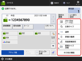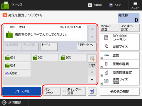 [設定の履歴]を押すと、過去にファクスを送信したときの設定を呼び出すことができます。送信したときの宛先も、設定と併せて反映されます。