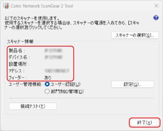 本機が選択されていることを確認し、[終了]をクリックする