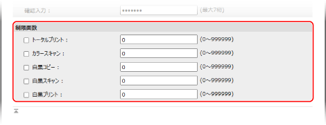 プリント/スキャン/コピーできるページ数を制限する場合は、対象の項目にチェックマークを付け、上限となるページ数を入力します。