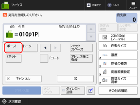 海外にファクスを送信する場合は、国際アクセス番号、国番号、ファクス番号の順に宛先を入力します。そのときに、番号と番号の間で[ポーズ]を押して、待ち時間(ポーズ)を入れます。