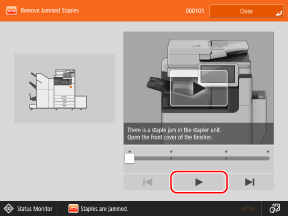 * The screen is repeatedly displayed until the paper or staple jam has been removed. When you press [Close], the screen may close temporarily, and you may be able to perform another operation or setting.