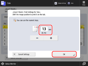 When copying onto the tab part, set the print position of the tab part by entering the adjustment width to apply to the tab original.