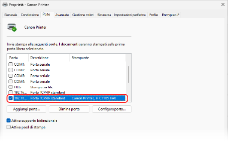 Se l'indirizzo IP della macchina viene modificato dopo l'installazione del driver della stampante, occorre aggiungere una nuova porta.