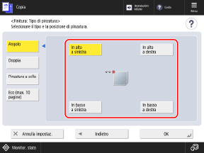 Se si preme [Piegatura a sella] al passaggio 1, è possibile premere [Regolazione posizione piegatura] per regolare la posizione di piegatura per ciascun formato carta.