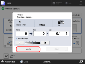Stop], selezionare il lavoro da annullare dall'elenco dei lavori di copia e premere [Annulla].