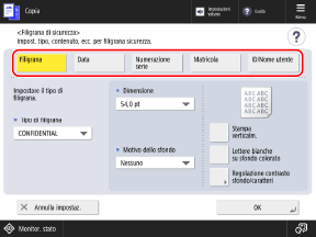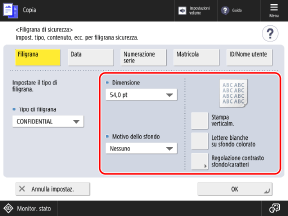 * Quando si esegue la regolazione con [Regolazione contrasto sfondo/caratteri] nella schermata [Filigrana di sicurezza], le opzioni [Impostazioni stampa] e [Inizializza] non vengono visualizzate.