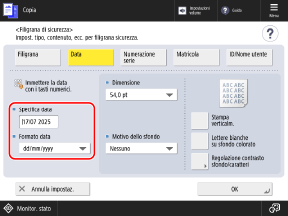 Le impostazioni configurate nella schermata [Filigrana di sicurezza] vengono applicate al formato caratteri della stampa di esempio.