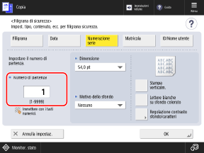 È possibile inserire la numerazione serie (per indicare l'ordine dei set di copie). Questa numerazione può essere utilizzata come numerazione di controllo per ciascun set di copie.
