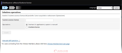 * Se il numero di accesso alla licenza non è fornito nel pacchetto dell'applicazione MEAP, non è necessario ottenere il file di licenza. Il file di licenza verrà fornito dal fornitore dell'applicazione. Per ulteriori informazioni fare riferimento al manuale di ciascuna applicazione.