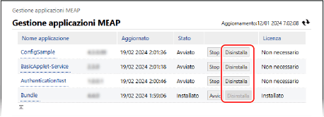 Fare clic su [Disinstalla] per le applicazioni MEAP che si desidera disinstallare.