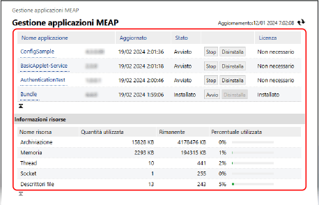 È possibile controllare i dettagli dello spazio di memorizzazione e di altre risorse utilizzate collettivamente da tutte le applicazioni MEAP*1, ad esempio l'entità utilizzata, l'entità rimanente e la percentuale utilizzata.