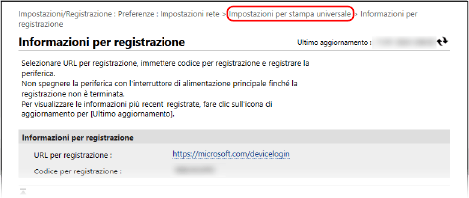 Fare clic sul link visualizzato accanto a [URL per registrazione] e registrare la macchina in base alle istruzioni a schermo.