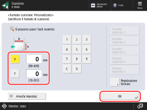 Attenersi alla procedura indicata di seguito per registrare i formati quando si utilizzano spesso degli originali con formati specifici non standard. È possibile richiamare il formato nella relativa schermata di inserimento, così da non doverlo inserire ogni volta.