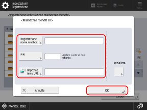 Le Mailbox fax riservati possono essere specificate con un nome e un PIN. È inoltre possibile configurare le impostazioni per inviare un avviso tramite e-mail quando viene memorizzato un fax.