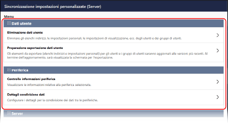 Pagina del portale dell'interfaccia utente remotaViene visualizzata la schermata [Sincronizzazione impostazioni personalizzate (Server)].