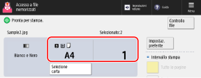 Nella schermata di selezione file in uno spazio di memorizzazione, selezionare un file e premere [Stampa] per visualizzare la schermata delle impostazioni di stampa.