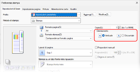 In [Orientamento] nella scheda [Impostazioni di base], controllare che[Orientamento] sia impostato con lo stesso orientamento impostato nel passaggio