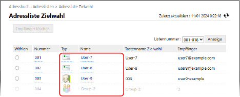 Dreistellige Nummern (001 bis 200) werden den Zielwahltasten zugewiesen. Wählen Sie oben rechts auf dem Bildschirm den Nummernbereich in [Listennummer] aus und klicken Sie auf [Anzeige], um die in der Liste angezeigten Nummern zu ändern.