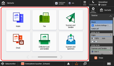 ![]() | [Statusmonitor] Sie können [Auftragsstatus/Protokoll] wählen, um den Verarbeitungsstatus und den Verlauf jeder Funktion sowie die verbleibende Menge an Verbrauchsmaterialien und Teilen zu prüfen. Sie können [Betriebszustand] wählen, um den Status des Geräts und der Vorgänge, die Ursachen von Problemen und Methoden zur Fehlerbehebung zu prüfen. |