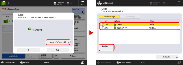 Stopp] gedrückt wird, wenn mehrere Sendeaufträge vorhanden sind Um einen anderen Auftrag abzubrechen, drücken Sie [Andere Aufträge prüf.], wählen Sie den abzubrechenden Auftrag aus der Sendeauftragsliste aus und drücken Sie [Abbrechen].
